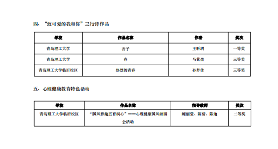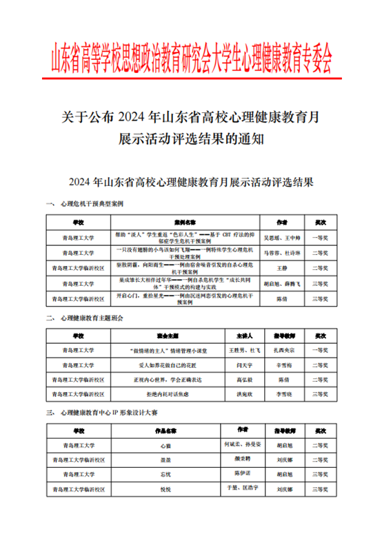 近日,2024年山东省高校心理健康教育月展示活动公布评选结果。36365官网在心理危机干预典型案例评选中荣获一等奖一项、二等奖两项、三等奖两项;在心理健康教育主题班会评选中荣获一等奖一项、二等奖两项、三等奖一项;在心理健康教育中心IP形象设计大赛中荣获二等奖两项、三等奖两项;在“致可爱的我和你”三行诗作品评选中荣获一等奖一项、三等奖两项;在心理健康教育特色活动评选中荣获二等奖一项。