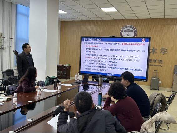刘强针对学校土木工程学科软科各项指标进行了解读,分析了学科发展存在的短板,他建议以学科分项指标为依据对标相关A类高校,优化学科资源布局,精准发力实现学科快速高质量发展。土木工程学院副院长白晓宇剖析了第五轮学科评估以来的学科建设情况,指出了现有的工作基础、问题和不足,并阐明了下一步工作思路和重点工作推进目标。