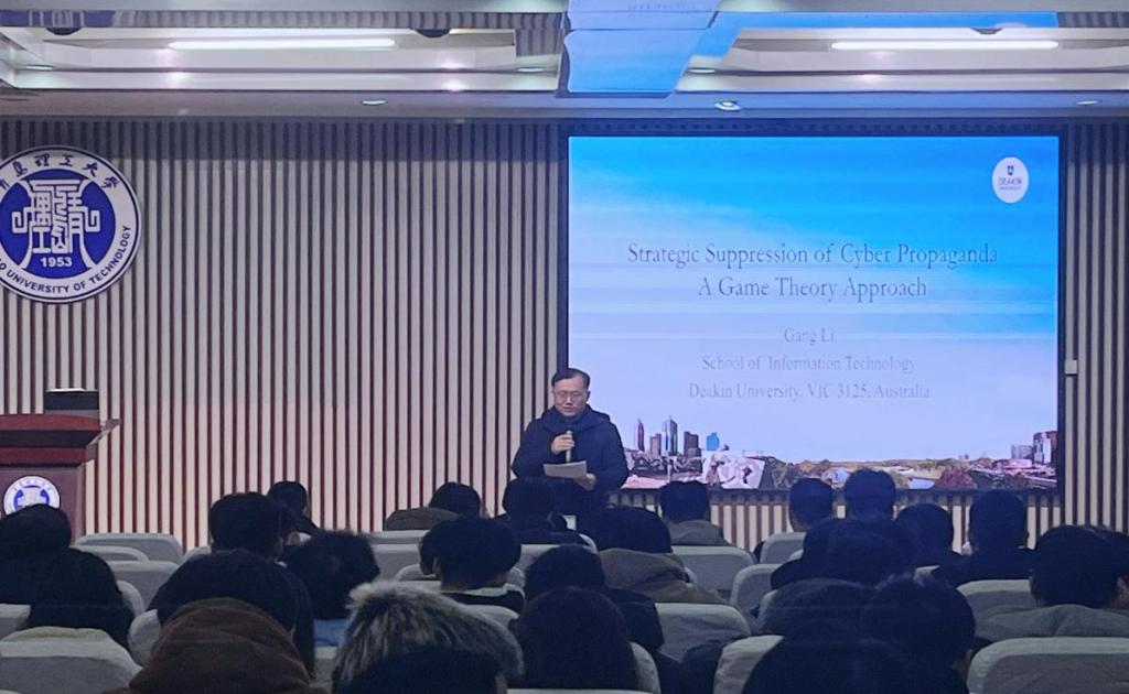 1月8日上午,信息与控制工程学院邀请澳大利亚迪肯大学学术委员会成员、信息技术学院李罡教授,到校作题为“Strategic Suppression of Cyber Propaganda:A Game Theory Approach”的学术报告。会议在主教学楼一楼东报告厅举行,学院副院长宋传旺主持,副院长张媛媛、青年教师骨干及200余名研究生和本科生参会。