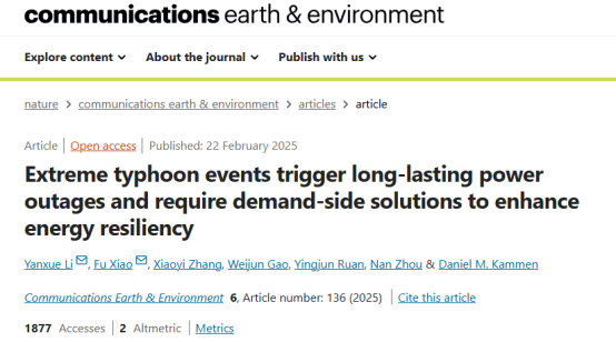 1.《Nature旗下期刊:极端台风下的住宅能源韧性方案》:Li, Y., Xiao, F., Zhang, X., Gao, W., Ruan, Y., Zhou, N., & Kammen, D. M. (2025). Extreme typhoon events trigger long-lasting power outages and require demand-side solutions to enhance energy resiliency.Communications Earth & Environment, 6(1), 136.