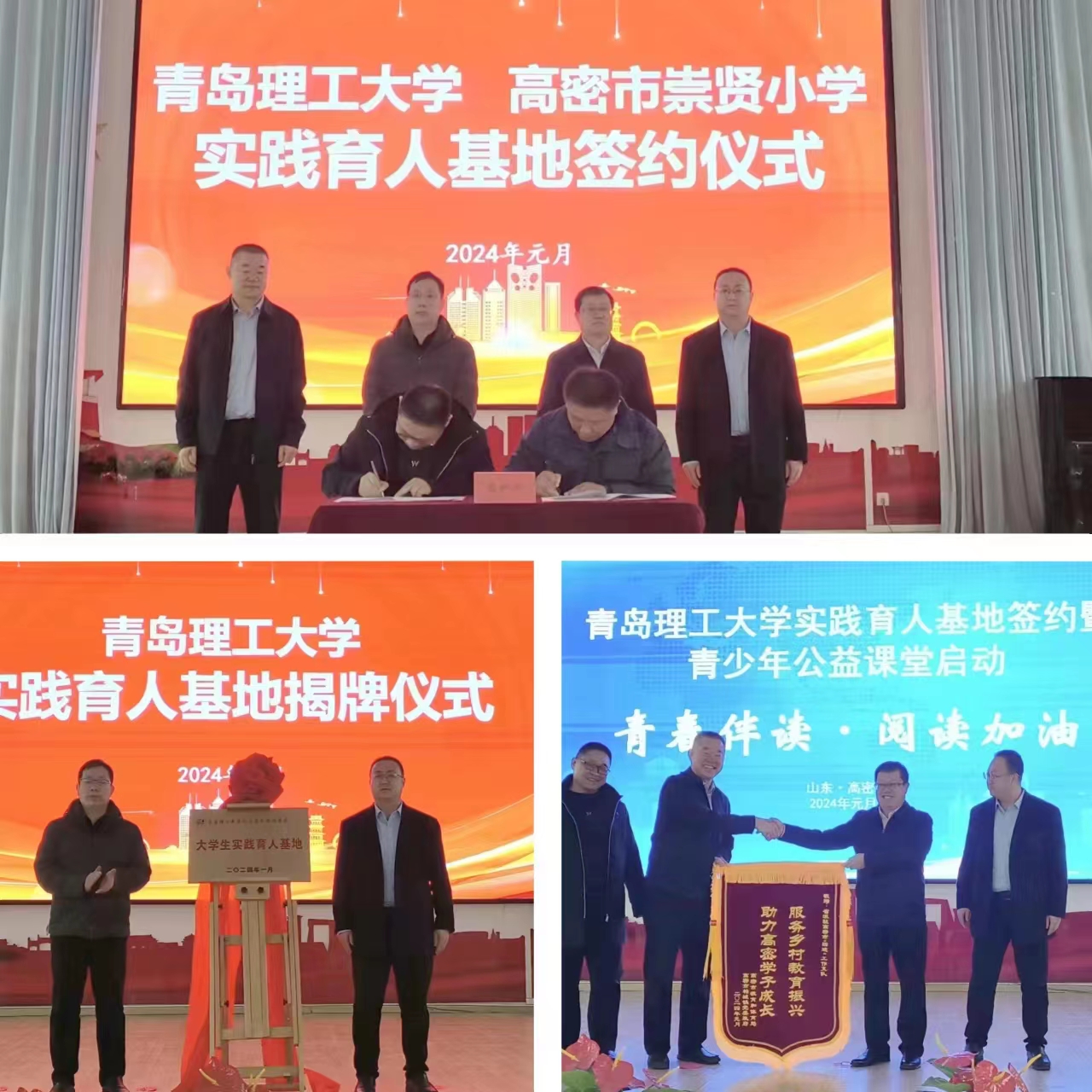 签约环节,张成福与高密市崇贤小学校长钟成签订bet36365路检测中心实践育人基地协议书。杨书胜与高密市柏城镇党委副书记、镇长王军哲共同为“大学生实践育人基地”揭牌。刘世颖与徐卫晓共同为高密市崇贤小学师生代表捐赠爱心图书。明辉与王军哲共同为省派驻高密市“四进”工作支队回赠锦旗。