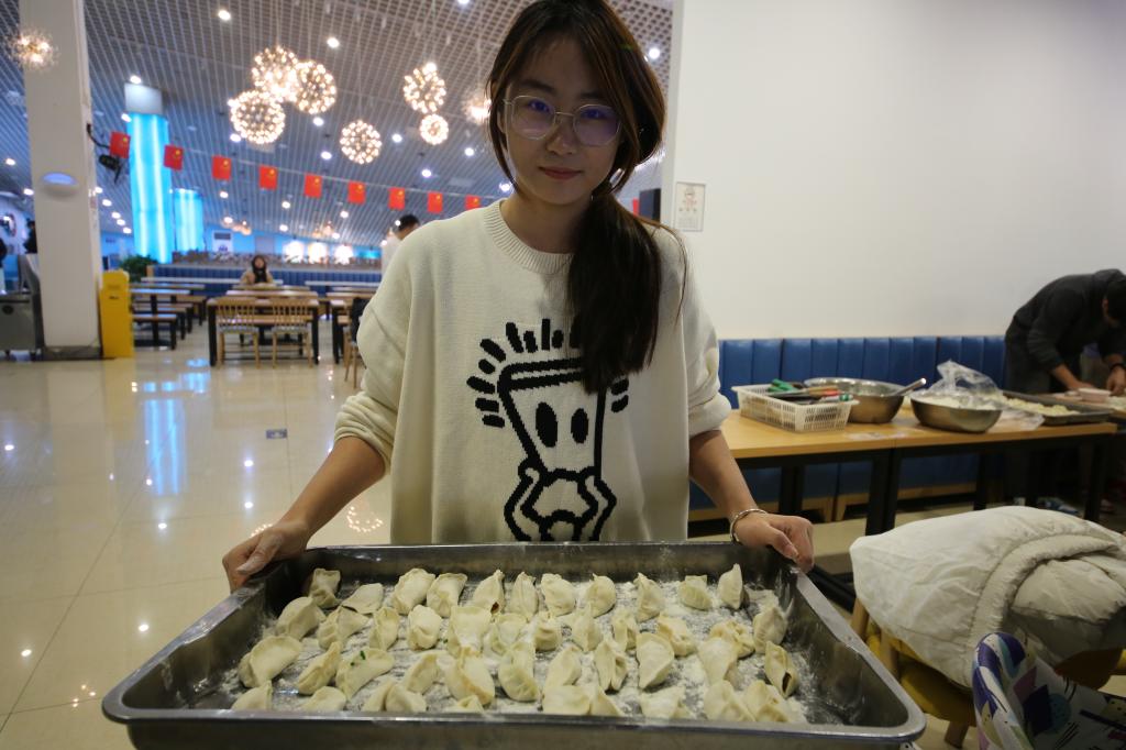 祥园餐厅的工作人员提前准备好了饺子皮,调好了饺子馅并备好了托盘等物料。师生们齐聚食堂一起包饺子,大家热情高涨,相互传授包饺子经验,忙得不亦乐乎。在欢声笑语中,在十指翻飞间,一只只精巧的饺子便诞生了,有的大有的小,有的圆有的扁,有的像小月牙,有的像金元宝,有的像小馄饨,有的像小笼包。马莉书记还手把手地教同学们如何擀皮,怎样包成一只圆鼓鼓的饺子。