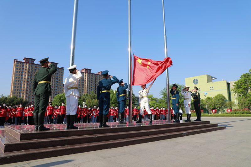 上午7时,在雄壮的国歌声中,鲜艳的五星红旗冉冉升起、迎风飘扬,全体师生肃然而立、行注目礼,内心满怀对党和伟大祖国的无限热爱与敬意。