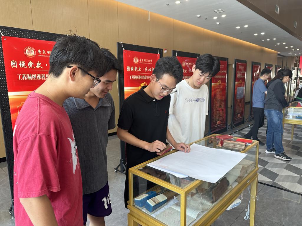 本次展览以工程制图课程为载体,以党史学习教育为主题,以图文并茂的形式,设置了“开天辟地”“改天换地”“翻天覆地”“惊天动地”四个板块,展出理学院工程图学部和档案馆50 余件融合党史叙事与工程图学技术的实物、海报,体现了专业教学与红色教育有机融合的生动过程和丰硕成果。展览为期一个月,面向全校师生开放。